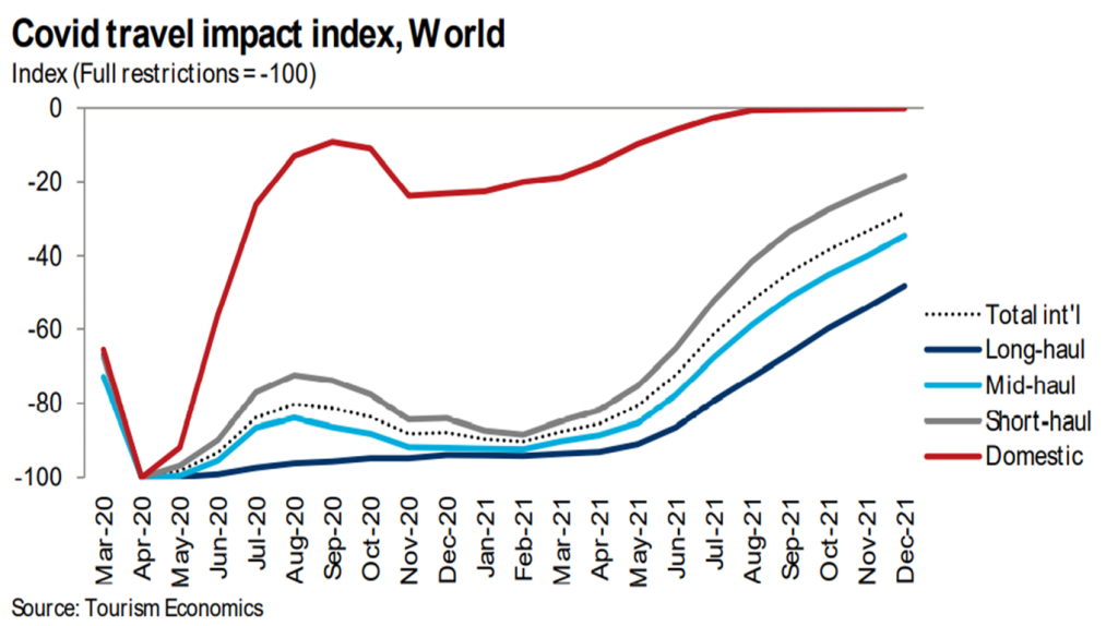 Si prevede infatti che per i viaggi nazionali le restrizioni scompariranno già entro la fine del 2021, mentre per quelli internazionali potrebbero essere ancora sotto al 50% rispetto ai livelli del 2019.