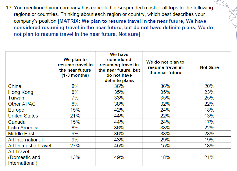 Ne emerge che circa la metà degli intervistati ha la volontà di poter tornare a pianificare viaggi nel breve pur non sapendo ben ancora identificare una precisa tempistica. Regioni asiatiche e Sud America sono le zone che più fanno mostrare prudenza nella ripresa. Stati Uniti, Canada e Germania sul fronte europeo le destinazioni verso le quali è maggiore la percentuale di chi è disposto a pianificare trasferte nel prossimo trimestre. Stupiscono in negativo invece i paesi scandinavi, rei probabilmente di aver tardato a rendere attive le misure di sicurezza rispetto al resto del continente.
